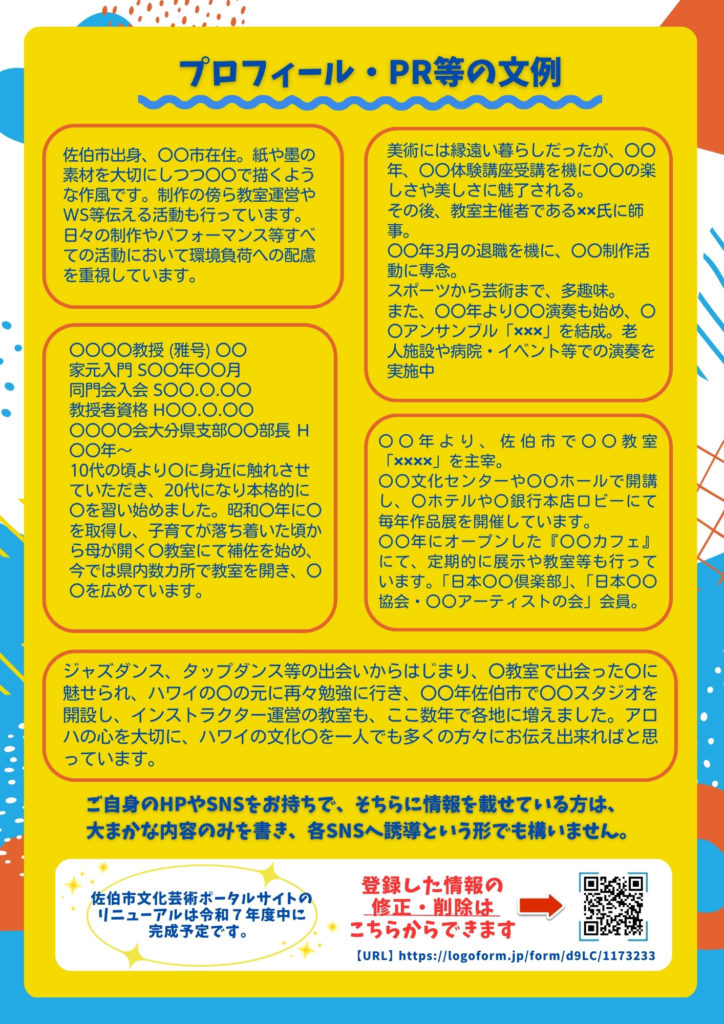 ご登録いただいた情報は、令和7年度内にリニューアルが完成するポータルサイトの【アーティスト・文化芸術団体】ページに掲載されます。(※現在リニューアルサイト作成中)