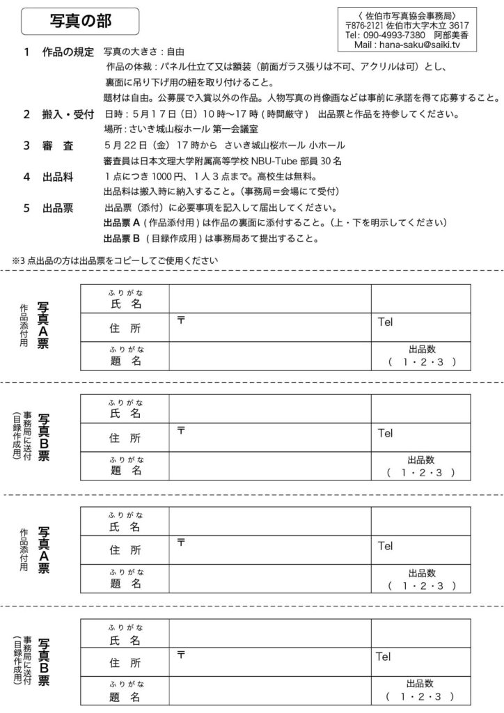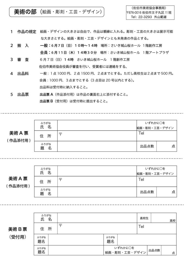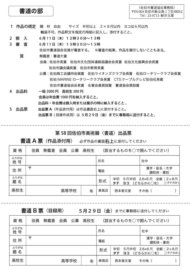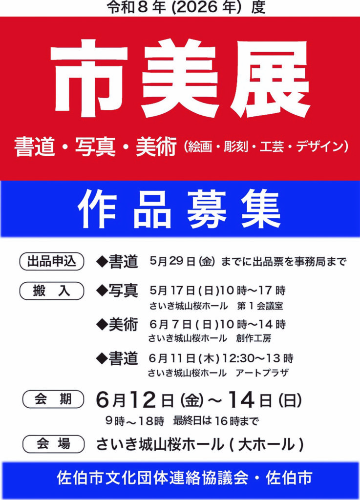 令和8年度佐伯市美術展の作品を募集します! 2026年3月25日 最終更新日時 : 2026年3月25日 mst-design 佐伯市の書道・写真・美術愛好者の作品発表の場となる公募美術展です。みなさまの作品の出品をお待ちしております。 詳しくは下記の募集要項をご覧ください。出品票を印刷することも可能です。 ※各応募票はクリックするとPDFが開きますので、ご使用のブラウザの機能より保存・印刷をして下さい。 【書道の部 出品表・詳細】 【写真の部 出品表・詳細】 【美術の部 出品表・詳細】