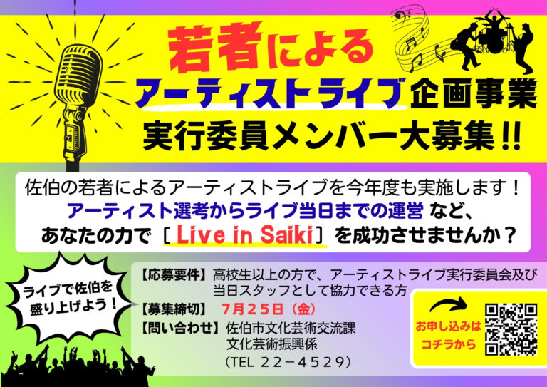 第3回目となる令和7年度の実行委員メンバーを、以下のとおり募集します。若者の力で、[Live in Saiki] を成功させませんか?